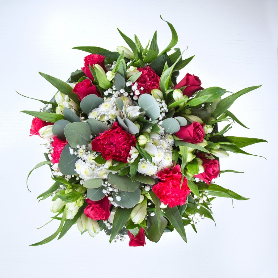 Delight in nature’s charm with our exclusive bouquet, crafted to spark your imagination. This arrangement combines soft white chrysanthemums and delicate gypsophila with passionate red roses and carnations, accented by elegant white alstroemeria and lush aspidistra leaves. The blend of colors creates a harmonious and sophisticated design.